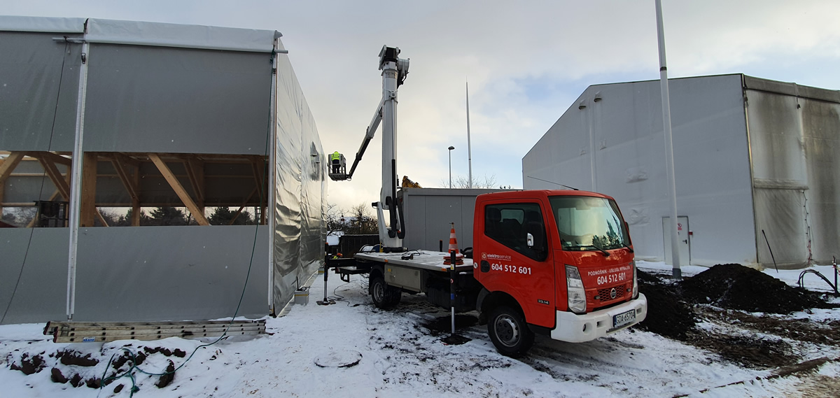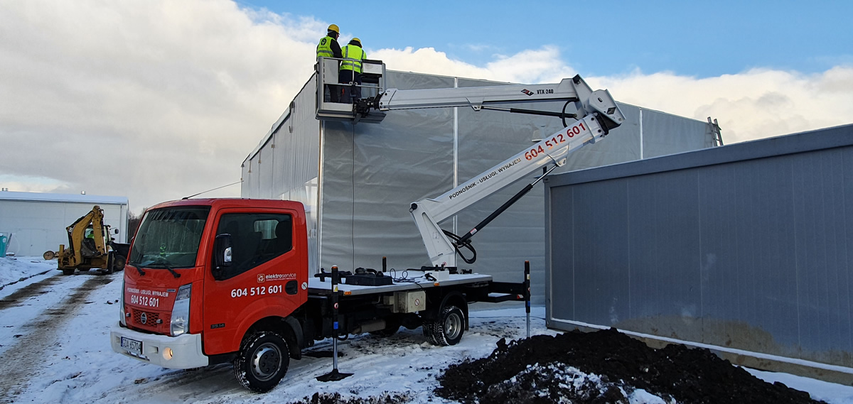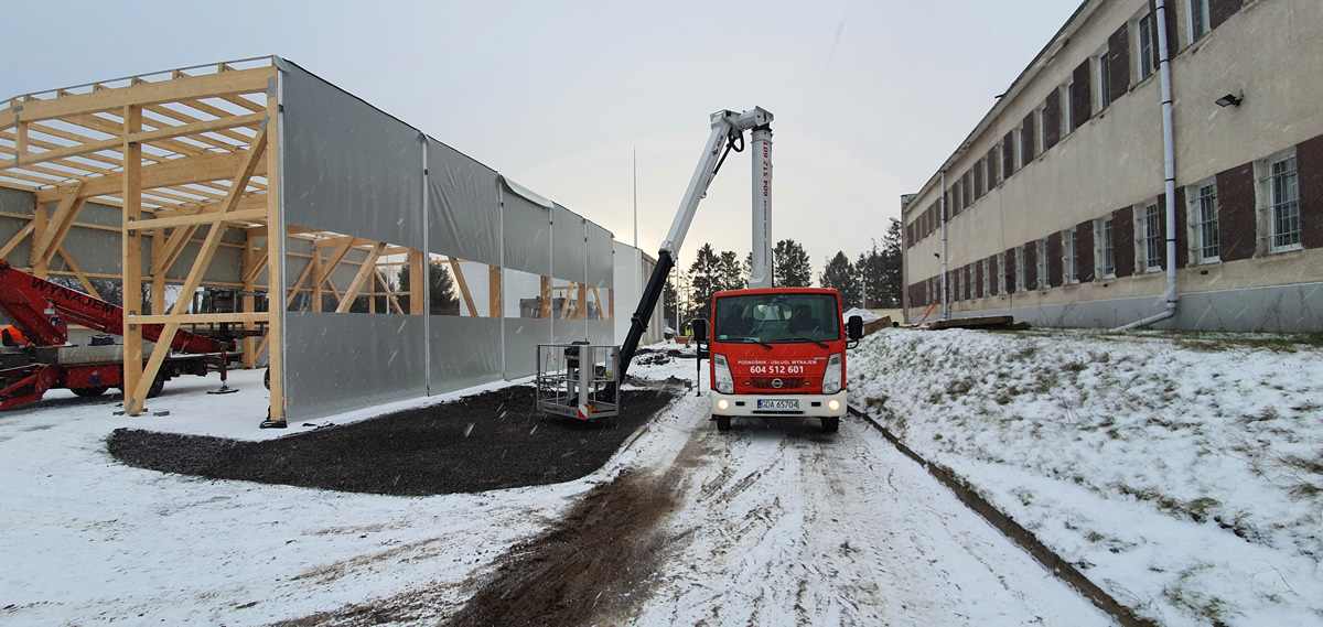 Podnośnik przy budowie hali namiotowej w Gdyni. Znakomicie sprawdził się tu szeroki zasięg wysięgnika naszego podnośnika i możliwość złamania się tuż na dachem pod kątem 90 stopni – co pozwoliło na dostęp praktycznie do każdego miejsca. Proszę zwrócic uwagę że ciężkie zimowe warunki nie wpływają na efektywność naszego podnośnika, który pracować może w każdych warunkach pogodowych.