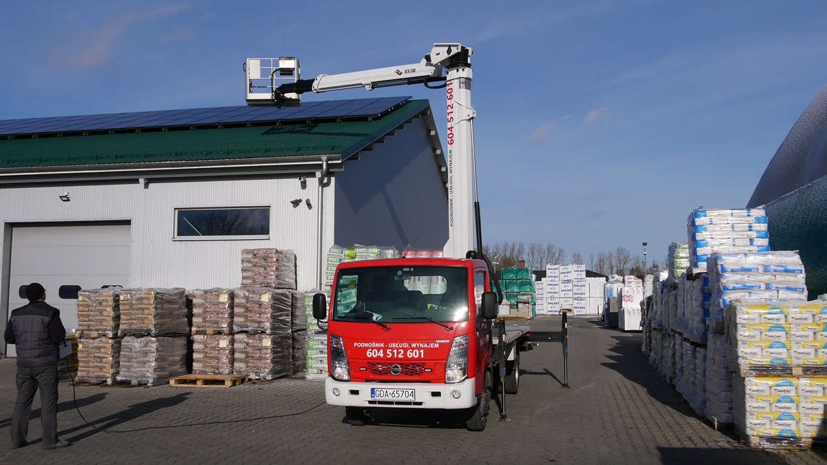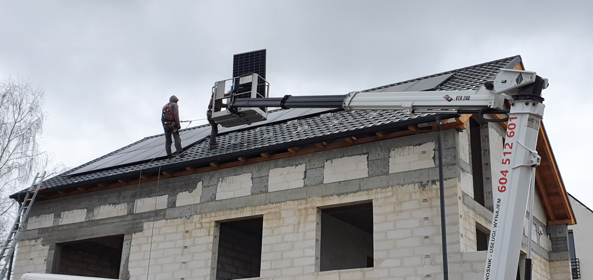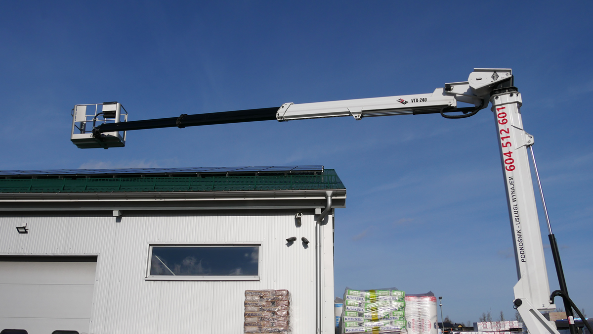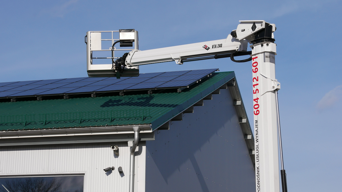 Nasz podnośnik świetnie sprawdza się do prac związanych z montażem fotowoltaiki. Szeroki zasięg pracy wysięgnika sprawia, że łatwo nim dotrzeć w miejsca trudnodostępne dla innych podnośników, zwłaszcza na połacie dachw o niewielkim pochyleniu. Możliwe są prace prowadzone z kosza podnośnika, jak również podawanie paneli do montażu na dachu.