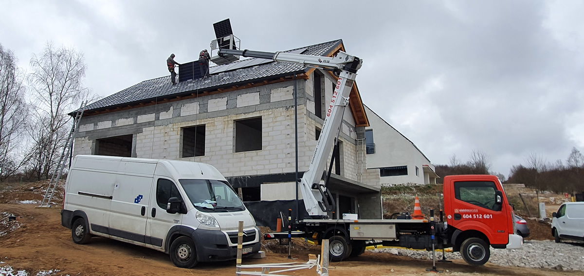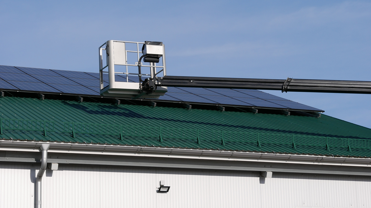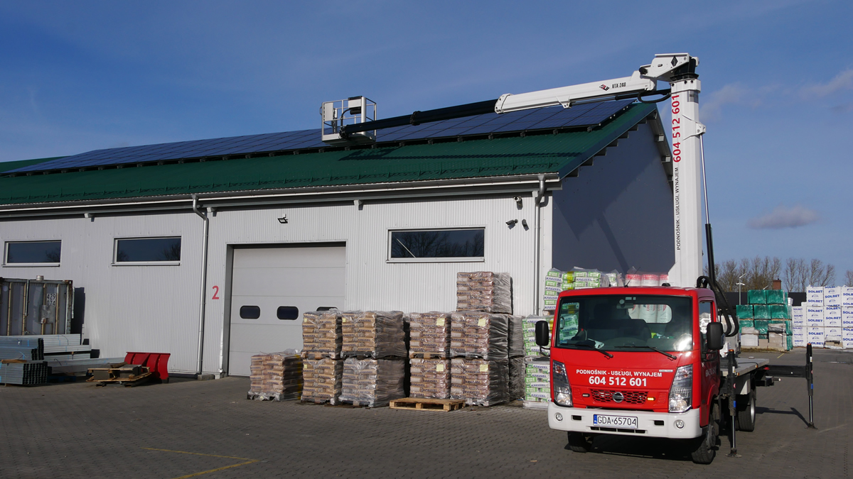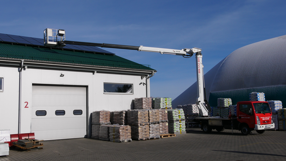 Nasz podnośnik świetnie sprawdza się do prac związanych z montażem fotowoltaiki. Szeroki zasięg pracy wysięgnika sprawia, że łatwo nim dotrzeć w miejsca trudnodostępne dla innych podnośników, zwłaszcza na połacie dachw o niewielkim pochyleniu. Możliwe są prace prowadzone z kosza podnośnika, jak również podawanie paneli do montażu na dachu.