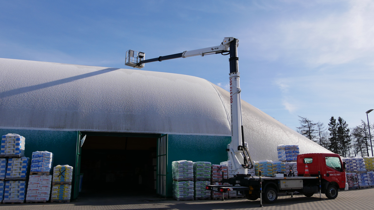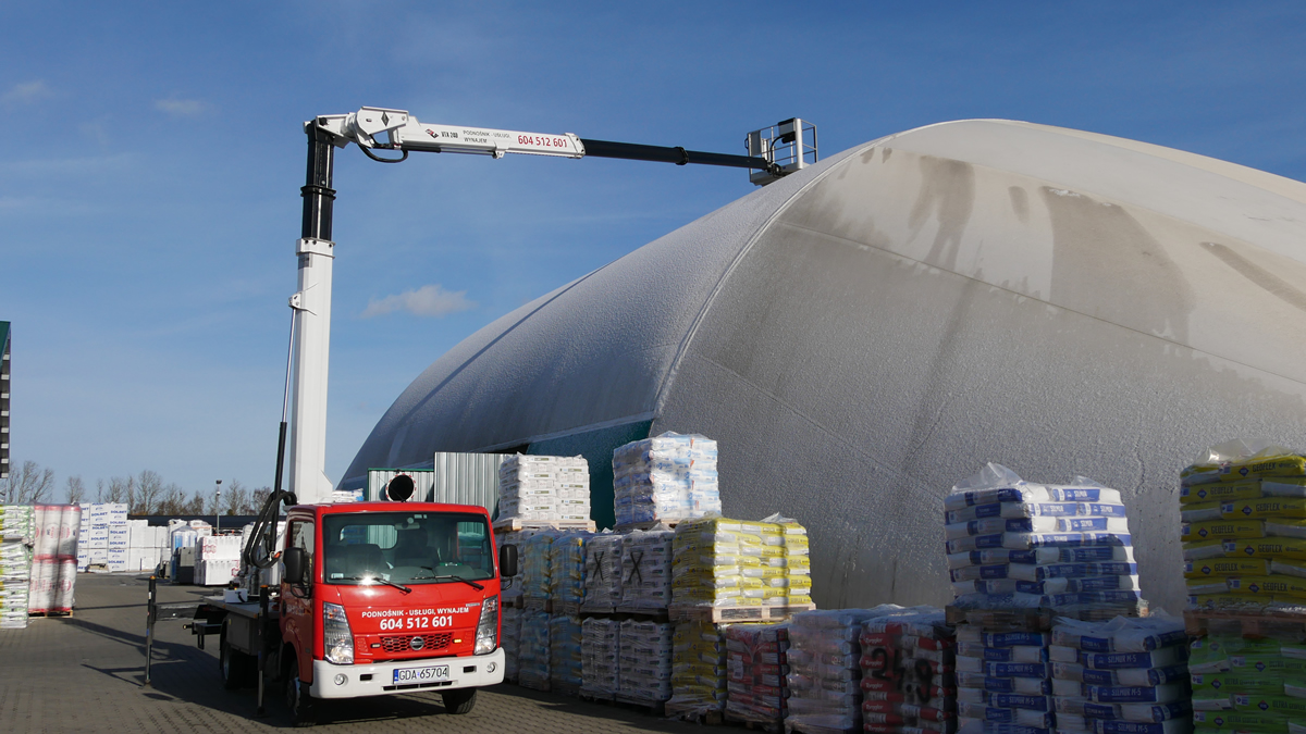 Przykład prac naszego podnosnika przy obsłudze namiotu ulokowanego w okolicach Trójmiasta. Zdjęcia pokazują możliwości dostepowe naszego podnosnika dzieki mozliwosci załmania się wysięgnika pod różnymi kątami. Mozliwość ustawienia ramienia wysięgnika nawet pod kątem 90 stopni jest dużym atutem, umożliwiającym dostęp praktycznie do każdego miejsca tego typu konstrukcji. Podnośniki koszowe pozbawione możliwosci załamania ramienia są w takich sytuacjach nieskuteczne.