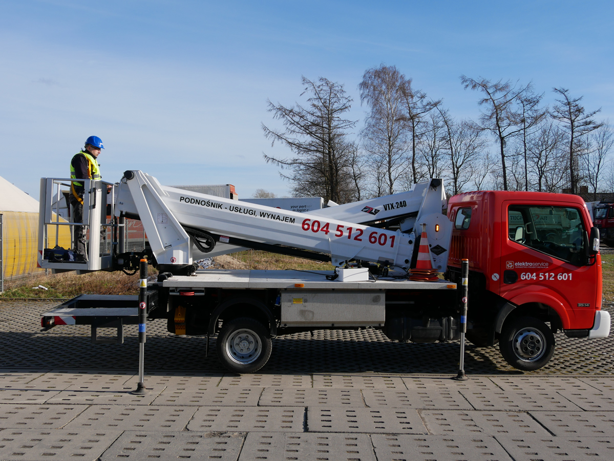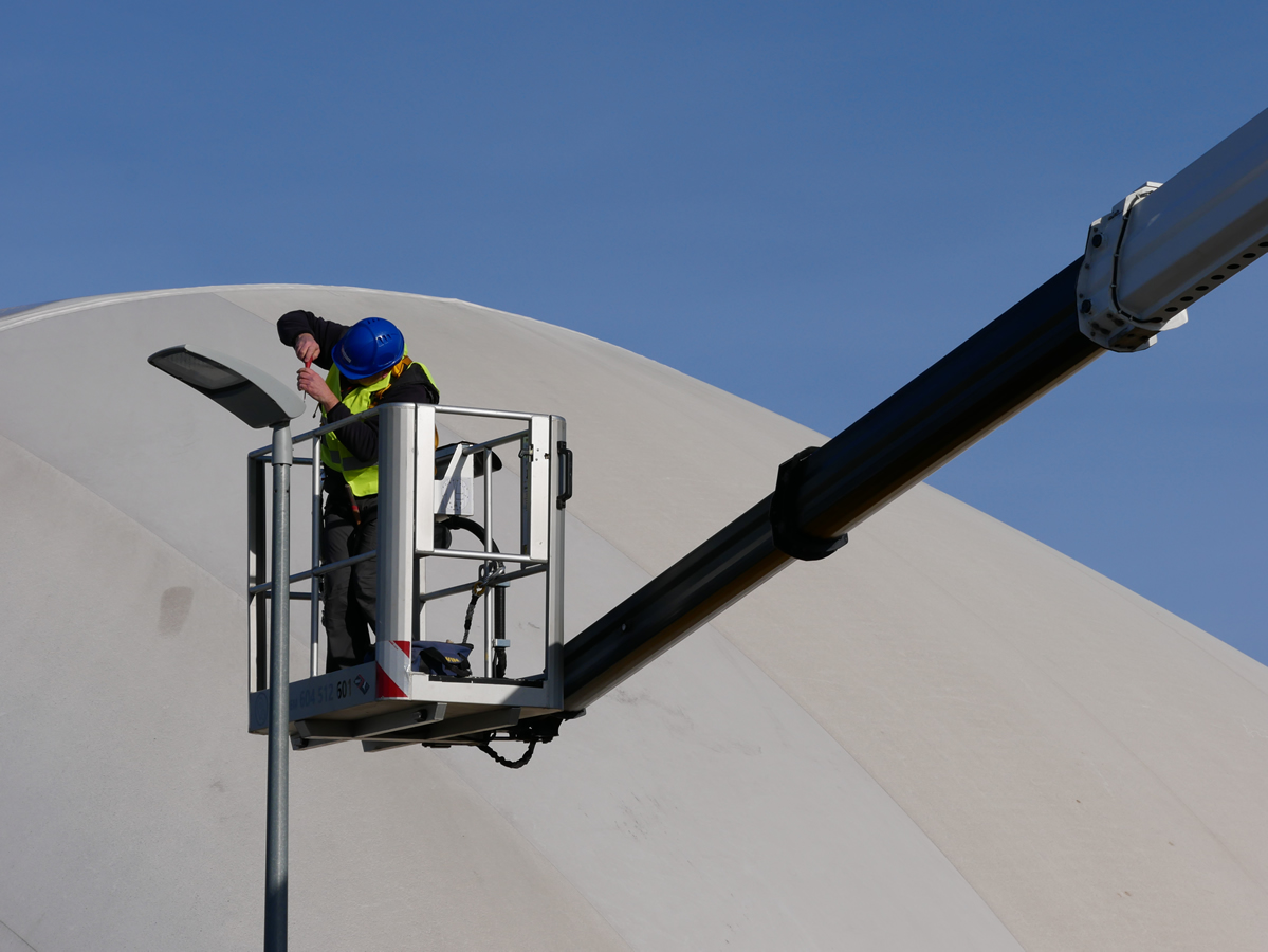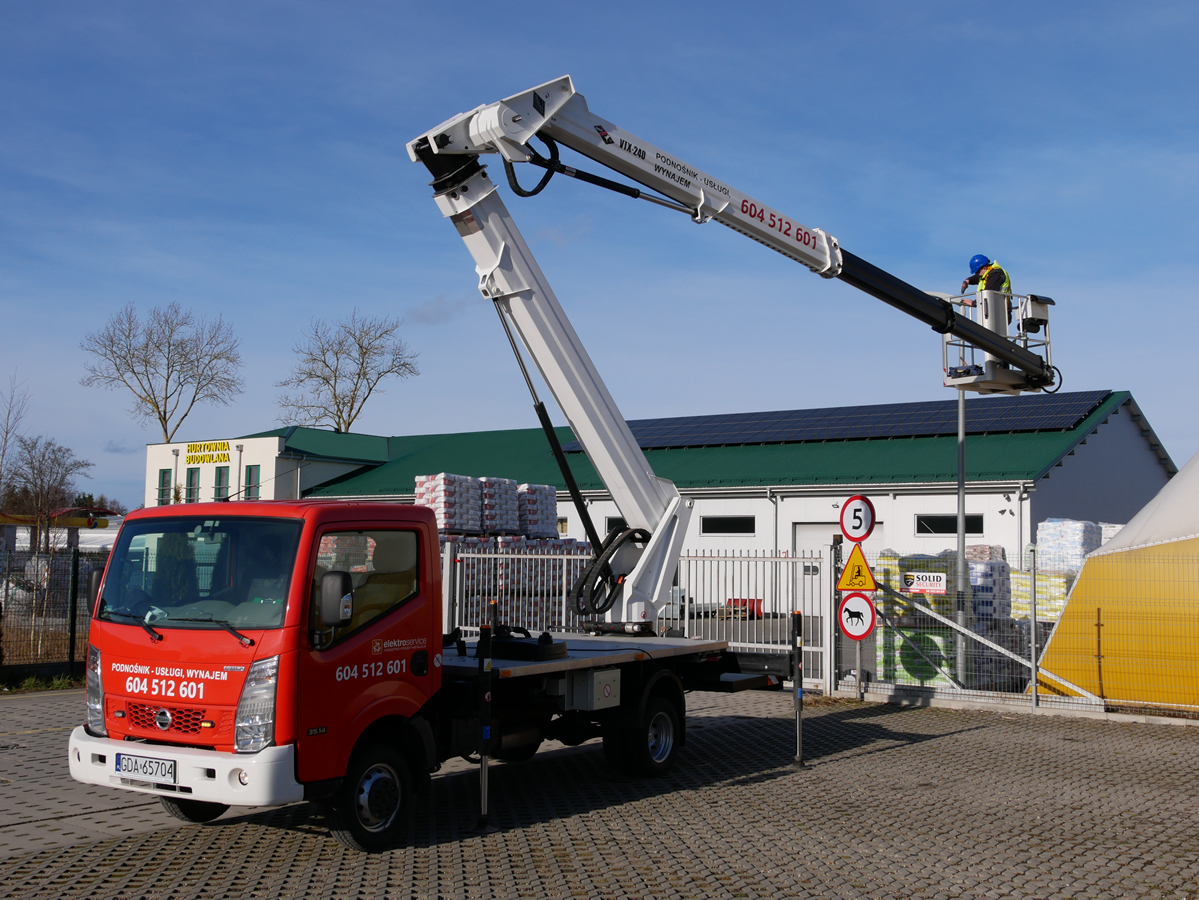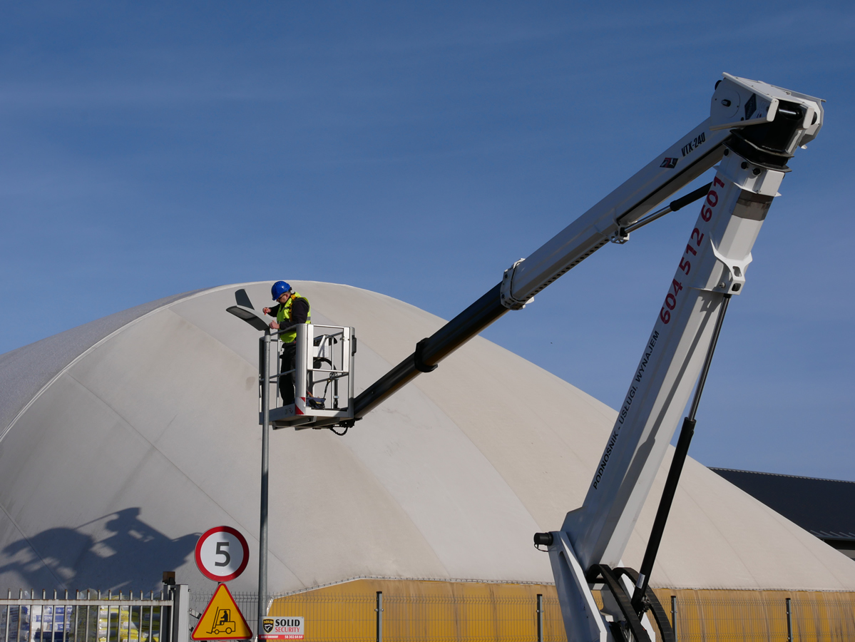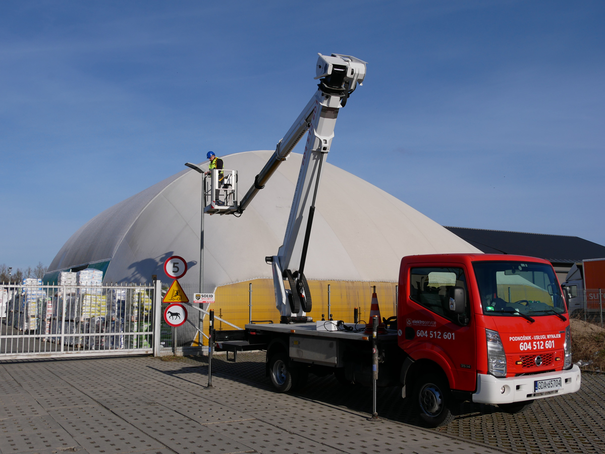 Naprawa oświetlenia ulicznego przy bramie wjazdowej w okolicach Trójmiasta. W ramach naszych usług świadczymy nie tylko wynajęcie podnośnika ale również usługi doswiadczonego operatora. Nasze doświadczenie z zakresu prac instalacyjnych pozwala jednocześnie realizację zlecenień z zakresu naprawy lub instalacji oświetlenia, kamer monitoringu i podobnych urządzeń.